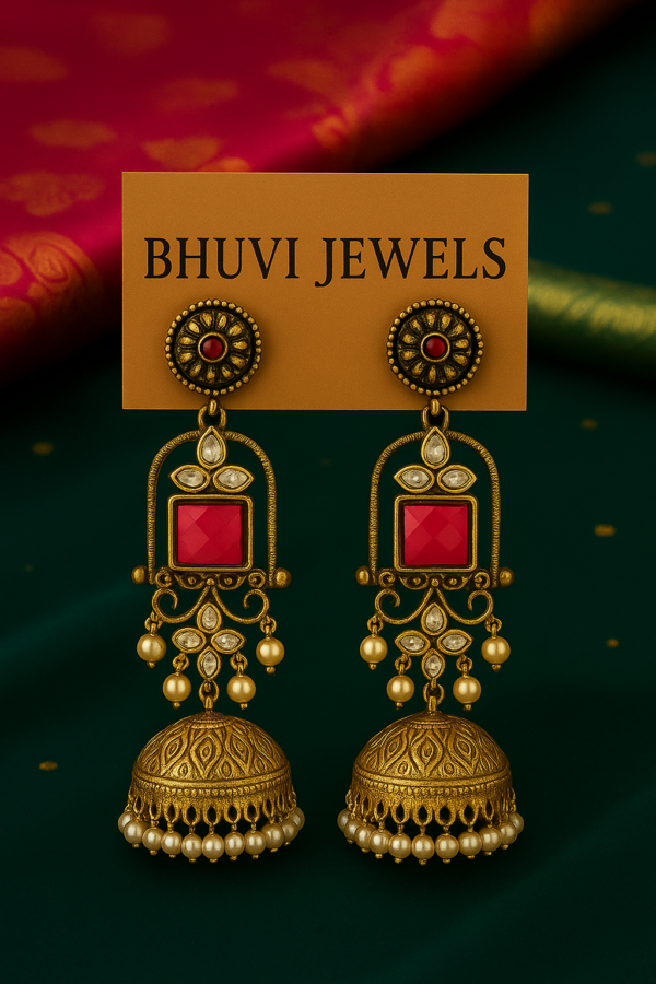 Add a regal touch to your ethnic look with these Royal Pink Kundan & Pearl Antique Jhumka Earrings from Bhuvi Jewels. Crafted with intricate antique coper plating, these earrings feature a bold pink square stone at the center, surrounded by delicate Kundan work and elegant pearl droplets. Perfect for weddings, festive occasions, and traditional events, these jhumkas blend timeless elegance with rich craftsmanship.